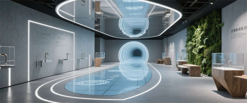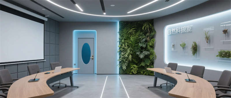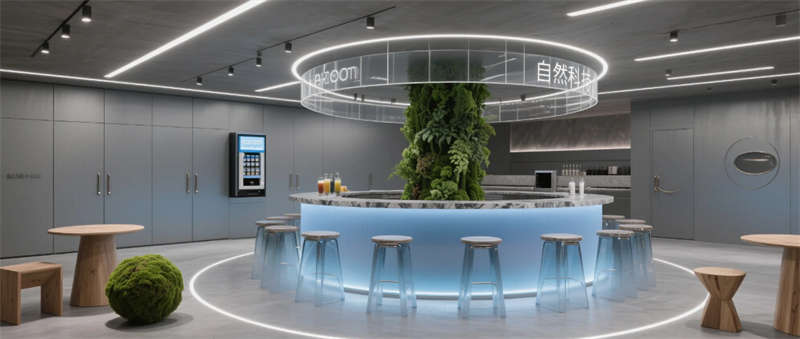 各區(qū)域通過(guò)四大統(tǒng)一性語(yǔ)言緊密串聯(lián):霧霾藍(lán)橢圓金屬門(mén)把手貫穿全空間,再生材料家具呼應(yīng)可持續(xù)發(fā)展理念,聲學(xué)墻面嵌入本地植物標(biāo)本強(qiáng)化生態(tài)屬性,智能燈光系統(tǒng)則通過(guò)4000K色溫線性燈帶實(shí)現(xiàn)晝夜場(chǎng)景的無(wú)縫切換。特別設(shè)計(jì)的全息投影展廳智能階梯會(huì)議室,通過(guò)LED交互地屏與AR懸浮展臺(tái),將品牌科技基因融入空間體驗(yàn)。