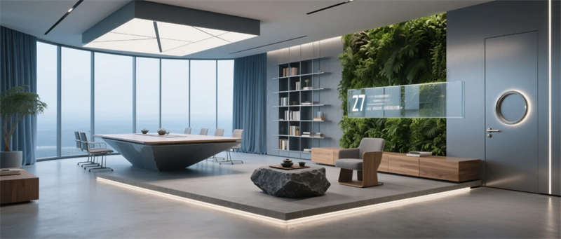 入口大廳以8米寬LED弧形屏呈現(xiàn)動(dòng)態(tài)視覺(jué)沖擊,懸浮曲面黑巖板前臺(tái)與天花垂墜的3D打印樹(shù)脂裝置形成虛實(shí)對(duì)話;開(kāi)放式辦公區(qū)通過(guò)模塊化磁吸工位與中央綠植柱,實(shí)現(xiàn)靈活協(xié)作與生態(tài)療愈的平衡;總裁辦公室270°全景落地窗搭配懸浮會(huì)議島,幾何切割天花與火山石茶臺(tái)演繹力量與自然的共生哲學(xué)。