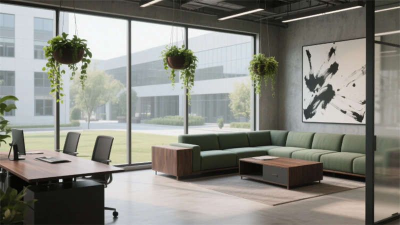 該辦公空間以"自然共生"為核心理念,將科技感與人文溫度融入兩千平米的開(kāi)放場(chǎng)域。流動(dòng)的淺木色調(diào)貫穿始終,啞光金屬與微水泥形成質(zhì)感對(duì)話,模塊化家具構(gòu)建靈活場(chǎng)景。綠植生態(tài)系統(tǒng)從空中吊籃蔓延至苔蘚墻面,模糊室內(nèi)外界限。