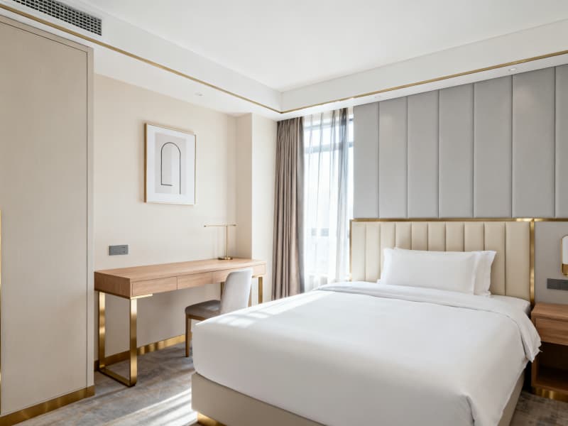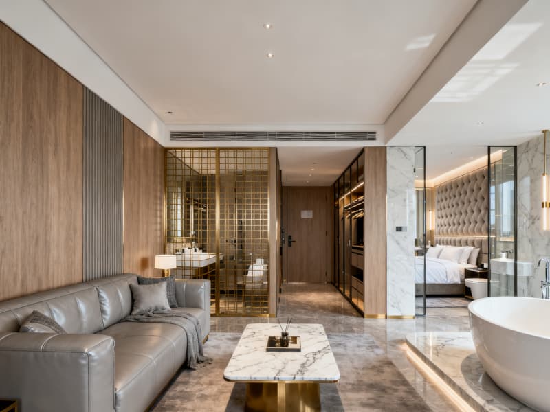 在空間布局上,充分利用4500平的開(kāi)闊尺度,合理劃分大堂、客房、餐廳、宴會(huì)廳、健身中心等功能區(qū)域。各區(qū)域銜接順暢,既保證商務(wù)出行的高效便捷,又滿足休閑旅居的舒適體驗(yàn)——例如標(biāo)準(zhǔn)客房注重實(shí)用性與靜謐感,行政套房強(qiáng)化尊貴感與功能性,宴會(huì)廳兼顧多元場(chǎng)景適配,健身中心與茶吧則豐富旅居生活維度。