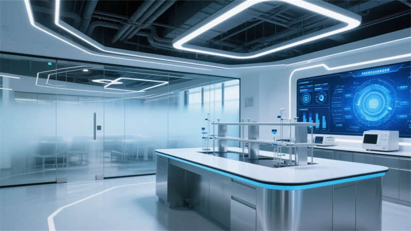 辦公空間呈現去中心化的未來圖景。模塊化工位可隨時重組為頭腦風暴環島,聲學織物包裹的膠囊艙提供深度思考庇護所。最具革命性的是“實驗室劇場”,研發設備的機械美學被提升為空間敘事的主角,集成于銀色島臺的精密儀器與頂部藝術化排布的管線系統,構成科技崇拜的現代祭壇。霧化玻璃墻在透明與隱私模式間瞬時切換,象征知識共享與知識產權保護的辯證統一。