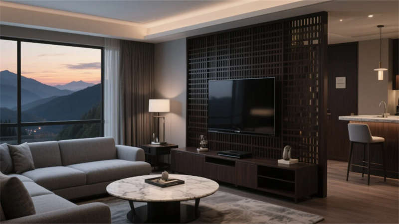 餐廳以工業風吊燈與綠植墻碰撞出活力氛圍,開放式取餐臺與大理石餐桌彰顯品質;行政套房客廳通過L型布藝沙發、木格柵電視墻與山景落地窗,打造出私享化的社交場景。