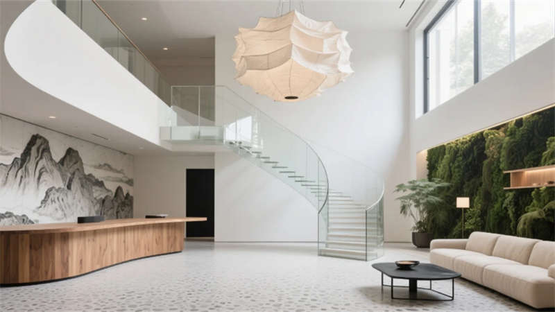 步入挑高的大堂,原木與石材的碰撞詮釋著質樸的高級感。懸浮玻璃樓梯如透明絲帶盤旋而上,紙藝褶皺吊燈灑下柔和光暈,綠植墻在隱藏式燈光中若隱若現,仿若一幅當代山水畫卷。客房以暖灰與米白為基調,亞麻、微水泥與天然木紋織就療愈氛圍,弧形沙發與嵌入式燈帶讓空間流動著溫柔詩意,落地窗將城市天際線化為朦朧背景。