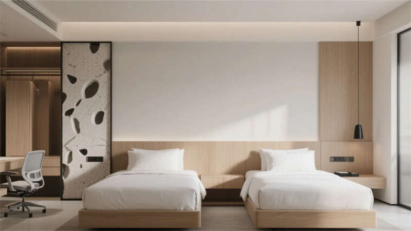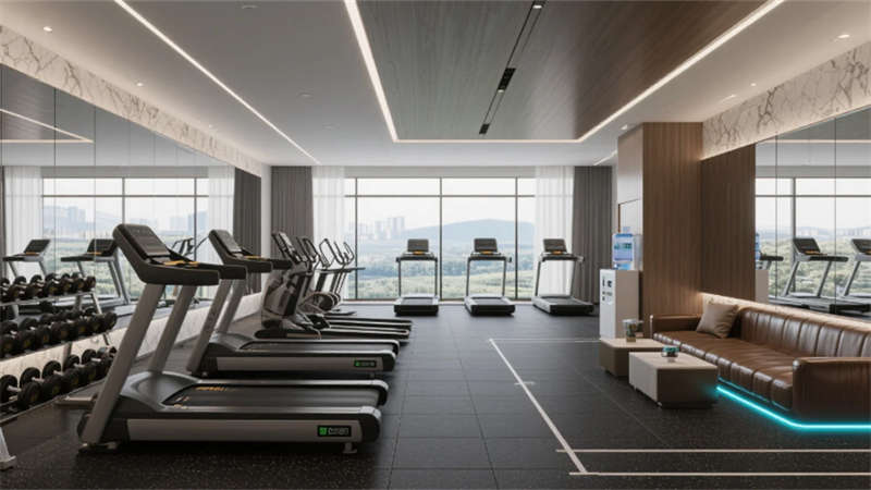 客房以中性色調為基底,亞麻、柚木與肌理墻面營造松弛感,智能化系統隱于無形,從電動紗簾到無線充電桌,細節中滲透科技溫度。雙床房的可移動屏風與定制家具,兼顧私密與靈活;衛浴空間以霧面玻璃與水磨石打造朦朧質感,啞光五金件點綴現代精致。餐廳以共享長桌與綠植墻激活社交氛圍,水磨石地面鑲嵌的黃銅線條如溪流蜿蜒,呼應徽派建筑中的流水意象。健身房鏡面與橡膠地面反射城市燈火,休憩區的皮質軟榻與漸變燈光,為運動后提供片刻寧靜。