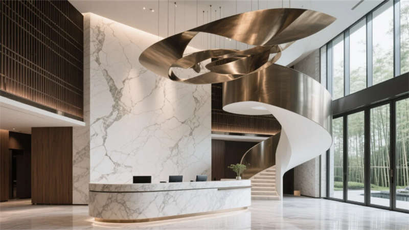 這座酒店以自然與人文的共生為靈感,將徽州山水意境凝練于現代設計語言中。建筑外觀以幾何切割的洞石立面與通透玻璃幕墻交織,垂直綠植如水墨筆觸般攀附墻體,入口處鏡面水景倒映天光云影,模糊建筑與自然的邊界。步入大堂,挑高空間內懸浮的螺旋樓梯與抽象金屬裝置形成動態視覺焦點,暖木格柵與冷冽大理石碰撞出靜謐與奢華的平衡,全景窗將庭院竹林景觀引入室內,光影隨時間流轉而變幻。