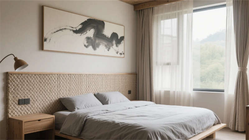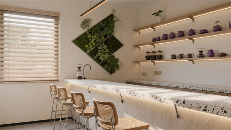 步入大廳,弧形亞麻沙發與編織地毯圍合出松弛場域,整面落地窗借景庭院竹影,琴葉榕與懸浮綠植墻形成立體生態敘事。多功能區以巢湖水波紋地毯呼應地域脈絡,壁爐旁的非遺火筆畫裝置暗藏城市文化密碼。咖啡吧藤編座椅與水磨石臺面碰撞,幾何綠植墻在百葉光影中演繹晨昏詩意。