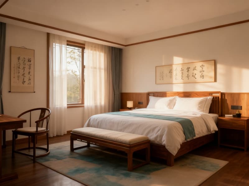 室內(nèi)空間借由廣角鏡頭可感知的通透布局,讓原木紋理成為空間的重要語言。公共區(qū)域的桌椅、隔斷均選用帶有自然木紋的實木材質(zhì),搭配淺色系軟裝,清晨的光線透過窗欞灑入,在木紋上形成柔和的光影,增添空間的層次感。客房設(shè)計注重細(xì)節(jié),床頭背景墻以簡約的中式紋樣點綴,床品選用素雅色調(diào),與原木家具呼應(yīng),營造出安穩(wěn)休憩的氛圍。?