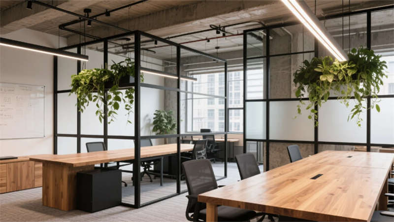 該辦公空間以暖調輕工業風為靈魂,將冷峻的金屬骨架與溫潤的竹木元素交織,在微水泥的灰調基底上鋪陳出理性與感性的平衡。開放辦公區借落地窗引光入室,綠植墻與軌道燈串聯起流動的協作場景;獨立專注艙與水吧區形成動靜分區,滿足深度思考與即時社交的雙重需求。