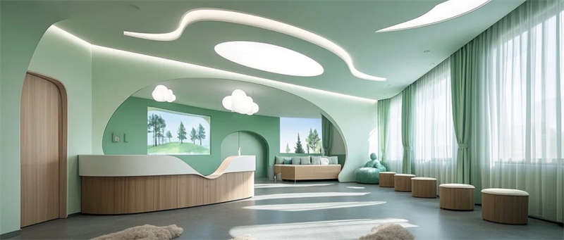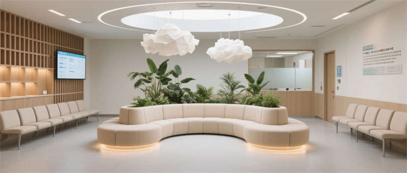這個(gè)醫(yī)療空間以自然療愈為語(yǔ)言重塑傳統(tǒng)醫(yī)院體驗(yàn)。建筑內(nèi)部流動(dòng)的淺木與灰綠色系,搭配原生綠植景觀墻,模糊了室內(nèi)外邊界,讓自然光與綠意成為治愈媒介。門(mén)診走廊的弧形墻面消解機(jī)構(gòu)冰冷感,兒童診區(qū)的森林投影與云朵軟包,用敘事化設(shè)計(jì)緩解診療焦慮。