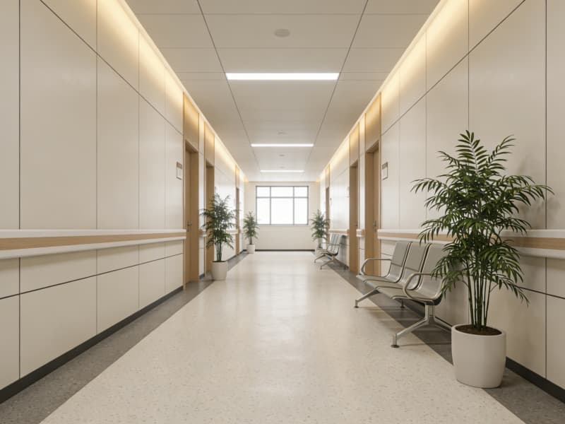 門診大廳以淺木色與純凈白為基調,挑高空間搭配懸浮式吊頂,自然光透過大面積落地窗灑入,與室內精心布置的景觀綠植呼應,消解患者的緊張感。分診臺采用弧形設計,圓角處理的臺面與溫潤的材質傳遞出細膩關懷。