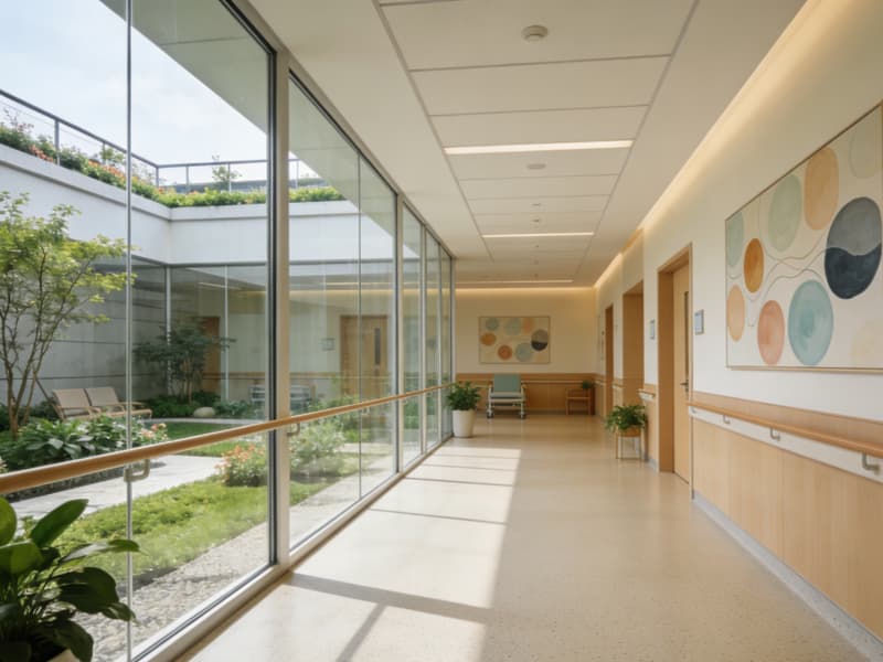 康復區與屋頂花園相連,通透的玻璃隔斷讓自然光線充分進入,地面采用防滑且富有彈性的材質,墻面懸掛療愈系畫作,患者可在此享受陽光與綠植的雙重滋養。