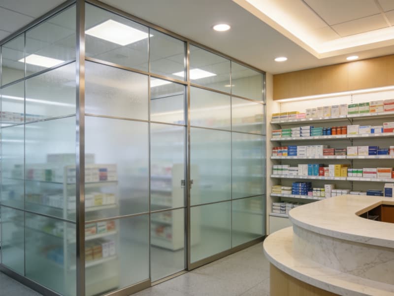 藥房采用半通透的玻璃隔斷,內部陳設整齊有序,取藥臺高度貼合人體工學,溫和的燈光讓藥品陳列既清晰又不刺眼。