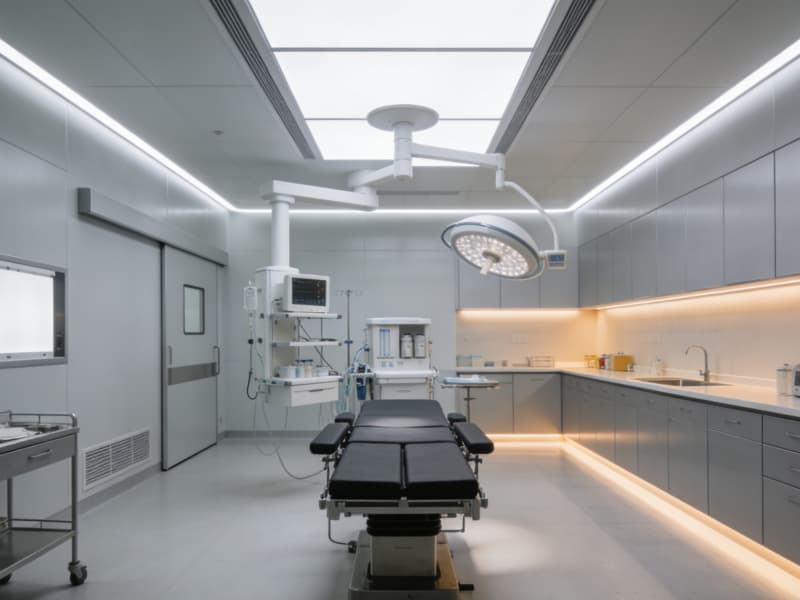 手術室區域以潔凈的灰白色為主,搭配暗藏式燈帶與防菌墻面,動線設計清晰流暢,確保高效運作的同時,通過局部的暖光點綴弱化冰冷感。