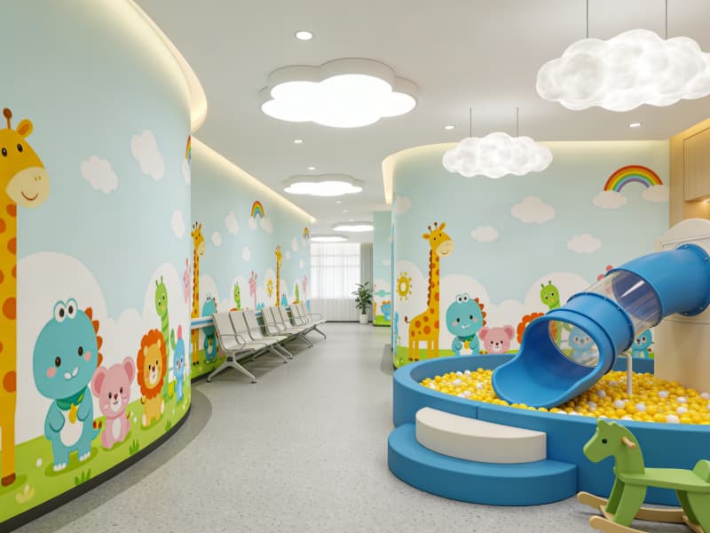 兒科專區則融入柔和的弧線與低飽和的馬卡龍色調,墻面繪制童趣圖案,候診區設置小型游樂角,用輕松氛圍緩解孩童對就醫的恐懼。整個空間在保障醫療功能的同時,讓自然與人文關懷貫穿始終。