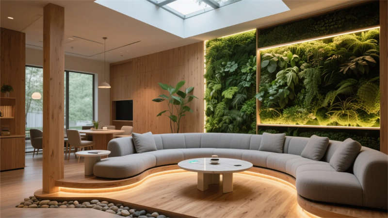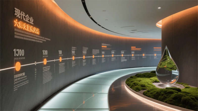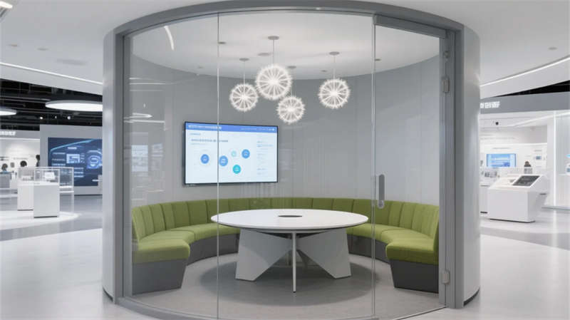 入口以光帶引導(dǎo)與生態(tài)綠墻開啟敘事,核心展區(qū)通過(guò)懸浮觸控與嵌入式展臺(tái)聚焦技術(shù)創(chuàng)新。數(shù)字沙盤區(qū)突破物理限制,以天地屏聯(lián)動(dòng)呈現(xiàn)發(fā)展藍(lán)圖;智能會(huì)議艙可隨時(shí)轉(zhuǎn)化為協(xié)作中樞,通透隔斷維持空間對(duì)話性。文化長(zhǎng)廊以光影步道承載企業(yè)精神,生態(tài)休憩區(qū)則借自然光影與苔蘚景觀構(gòu)建減壓綠洲。
