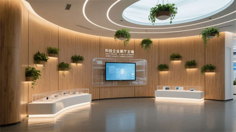 該展廳以“科技與自然共生”為理念,打造具有呼吸感的未來(lái)辦公展示空間。暖灰木紋肌理與流動(dòng)曲線構(gòu)筑空間骨架,智能光帶如脈絡(luò)貫穿始終,在冷調(diào)科技感中融入垂直綠植與天然材質(zhì),平衡數(shù)字時(shí)代的溫度需求。
